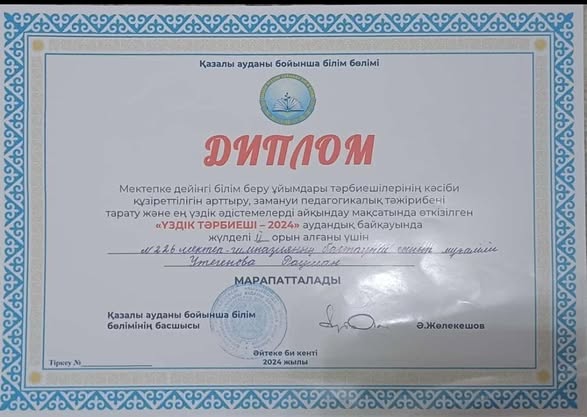 Қазалы аудандық білім бөлімінің ұйымдастыруымен тәрбиешілердің кәсіби құзіреттілігін арттыру және педагогикалық тәжірибені тарату мақсатында өткізілген «Үздік тәрбиеші - 2024» аудандық байқауынде Б.К.Мергенбаев атындағы №226 мектеп-гимназияның бастауыш сынып мұғалімі Утегенова Раушан жүлделі ІІ орын иегері атанды.